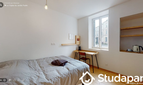 1 chambre(s) libre(s) dans une colocation de 1 chambres dans un appartment de 130m2 Belle chambre au 1er étage, située dans très beau coliving de 5 chambres dans le quartier Jardin Public/Fondaudège. Lieu de charme en centre ville, confortable et convivial. Les autres locataires sont étudiants ou jeunes actifs. Dans la chambre : - lit en 140 - bureau - salle d'eau et wc privatif Profitez de beaux espaces commun : - Salon - Une maginifique cuisine équipée avec votre compartiment frais privatif - Machine à laver - Espace vélo Loyer toutes charges incluses : 750€ Dépot de garantie un mois de loyer hors charges : 515€ Frais de dossier : 150€ Toutes les charges sont incluses, rien à ajouter - Chauffage - Climatisation - Electricité - Eau froide et chaude - Internet - Assurance - Internet haut débit - Linge de maison - Ménage des communs hebdomadaire DPE A Updated on 18/11/2025 Mise à jour le 18/11/2025