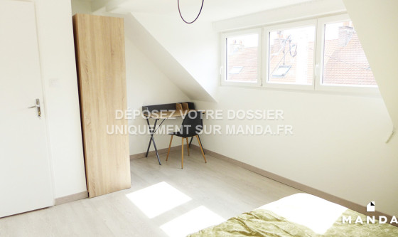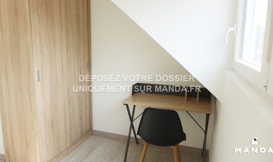Logement Manda ! Visitez et déposez votre dossier uniquement sur notre plateforme ! Nous ne vous enverrons jamais le bail ou le RIB par mail - tout est sécurisé sur notre plateforme. A 15 minutes à pied de la station de métro Porte d'Arras (Ligne 2), Manda vous propose cette chambre en location dans une colocation meublée dans une maison calme et agréable. Votre séjour disposera d'un grand canapé, une table basse, un meuble de télévision, une télévision, une table, un meuble de rangements et quatre chaises. Votre cuisine disposera d'un évier, des plaques de cuisson, un four, un four à micro-ondes, une hotte aspirante, un réfrigérateur avec compartiment congélateur, deux tabourets avec une table-bar et des espaces de rangement avec vaisselle et ustensiles de cuisine. Vous pourrez accéder à la terrasse et le jardin à travers la grande baie vitrée. Au fond du jardin se trouve un abri pour ranger du matériel. Dans votre première salle d'eau, vous disposerez d'une douche, un lavabo avec miroir et placard, un sèche-serviette électrique et un lave-linge. Dans votre deuxième salle d'eau, vous disposerez d'une douche, une vasque avec miroir et placard, un sèche-serviette électrique et un lave-linge. Des toilettes sont également présentes au rez-de-chaussée. Votre chambre est au second étage à gauche sur le plan et la quatrième à être visible sur la vidéo. Elle dispose d'un lit double, une table de chevet, un bureau, une chaise et un armoire de rangements. Belles prestations pour cette chambre en location dans une colocation spacieuse, lumineuse et calme. Les charges comprennent l'eau courante, l'électricité, l'eau chaude, le chauffage, internet et l'entretien des parties communes. Cette chambre est idéale pour un étudiant ou un jeune actif ! Pour rappel, cet appartement est situé dans une zone soumise à encadrement des loyers. Loyer de base : 103,0€ Loyer de référence majoré (Loyer de base à ne pas dépasser) : 124,0€ Complément de loyer : 276,0€ VOUS POUVEZ VISITER PLUS DE 3 000 LOGEMENTS (visite virtuelle + vidéos) ET DÉPOSER VOTRE CANDIDATURE SUR LE SITE WEB MANDA (REF : MANDA-05999) Référence du bien : MANDA-05999