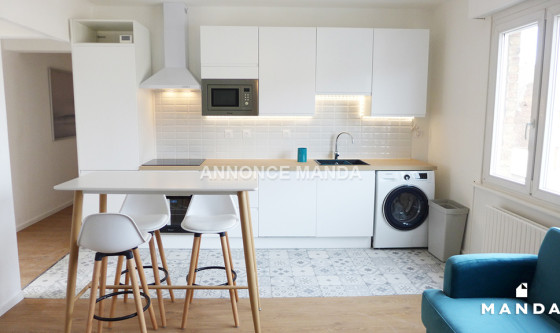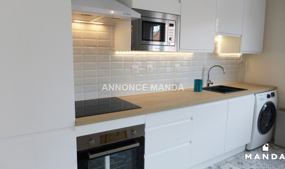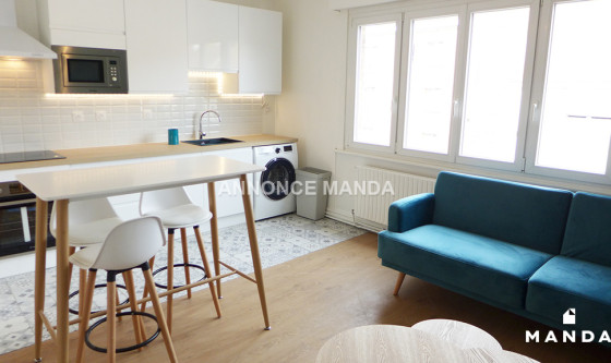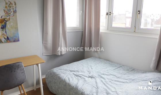Logement Manda ! À Lille, à proximité des stations de métro Mairie d'Hellemmes et Marbrerie (à 3 stations de Gare Lille-Flandres ), Manda vous propose une chambre en colocation dans un superbe T4 meublé en location, situé au 2ème et dernier étage. L'appartement a été refait à neuf. La pièce principale comporte canapé, tables basses, télévision, meuble TV, écran plat, table haute avec chaises hautes. Salon avec TV connectée et box Internet – Wifi dispo dans l'appartement La cuisine ouverte est entièrement équipée et aménagée : vaisselle, casseroles, rangements, évier, microonde, lave-vaisselle, four, plaques à induction, hotte aspirante, réfrigérateur, congélateur. La chambre présente lit double, lampe de chevet, bureau, dressing. Salle d'eau attenante avec douche, vasque. Chaque chambre possède sa clé personnelle. Les toilettes sont séparées. L'appartement possède une cave au sous-sol (pour les vélos c'est pratique !). Très belles prestations pour cette chambre en colocation dans un T4 meublé en location : lumineux, refait à neuf, bien aménagé avec de nombreux rangements. Pour rappel, cet appartement est situé dans une zone soumise à encadrement des loyers. Loyer de base : 123,6€ Loyer de référence majoré (Loyer de base à ne pas dépasser) : 148,8€ Complément de loyer : 291,2€ Référence du bien : MANDA-07371