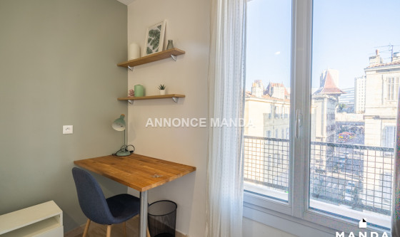 Logement Manda ! Située à Marseille, cette chambre dans un T4 meublé en colocation de 58m2 se trouve Avenue Camille Pelletan. A quelques minutes à pied de la station de métro Désirée Clary et à moins de 10min à pied de la gare Saint-Charles, le logement est proche de toutes les commodités. L'électricité, le chauffage, l'eau chaude, le gaz et internet sont inclus dans les charges. L'appartement est composé d'un séjour, d'une cuisine ouverte, de 3 chambres, d'une salle de de bain avec douche, lave-linge et de WC séparés. Dans le salon, vous trouverez un canapé, une table basse, une TV, une table à manger, 2 chaises et un banc. La cuisine est équipée de plaques de cuisson, d'un four, d'un micro-ondes et d'un réfrigérateur avec congélateur. La chambre est entièrement meublée, avec lit, armoire et bureau. Cette jolie chambre en colocation n'attend que vous! Référence du bien : MANDA-33863