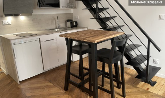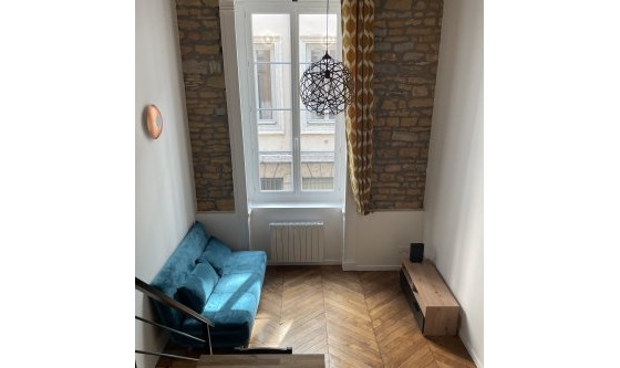 Studio de charme en plein Lyon 1er entièrement rénové. Le studio a une superficie de 28m² (24 m² en rez-de-chaussée et 10m² en mezzanine - 6 m² < 1m80). Les transports en commun sont tous accessibles à pied en quelques minutes (métro, vélo, bus, train). Idéal pour des étudiants ou professionnels en déplacement, il est uniquement loué en bail mobilité (de 1 à 10 mois).