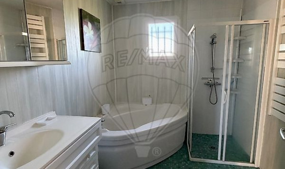 - Une salle de bain équipée d'une baignoire et d'une douche.
