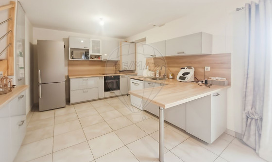 Maison récente située en plein centre, d'une surface habitable de 100,29 m². Au rez-de-chaussée : une pièce de vie donnant sur une terrasse entièrement clôturée, une cuisine ouverte aménagée et équipée (four, plaques, hotte), une salle d'eau avec WC, une buanderie avec branchement pour machine à laver, ainsi qu'un garage à vélos. À l'étage : trois chambres avec placards, une salle de bains et un WC indépendant.