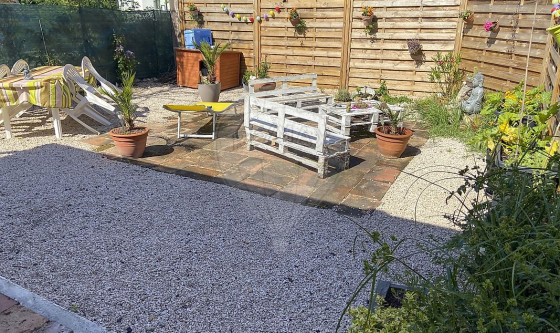 L'extérieur d'environ 50m2 quant à lui propose une agréable terrasse ainsi qu'un abri permettant de stocker et abritant la machine à laver.