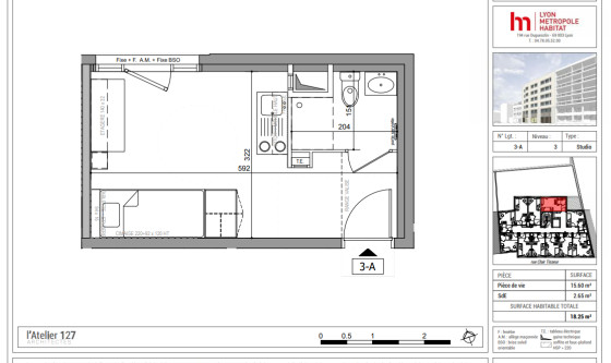 Lyon Métropole Habitat propose à la location un studio étudiant de 18,3 m², idéalement situé au coeur du 7ème arrondissement de Lyon, dans un quartier dynamique et convivial offrant commerces et services de proximité. A seulement 6 minutes à pied du métro Saxe-Gambetta, ce logement bénéficie d'une excellente desserte vers les universités et le centre-ville, tout en offrant un cadre de vie agréable et animé. Le studio est situé au 3ème étage avec ascenseur d'une résidence étudiante récente (2025) sécurisée, entourée d'espaces verts. Il comprend une entrée avec placard, une pièce de vie de 15,6 m² aménagée avec un lit, un bureau et une kitchenette équipée (réfrigérateur, plaque de cuisson, évier). La résidence offre de nombreux services dédiés aux étudiants, tels qu'une salle commune conviviale, une laverie et un local à vélos sécurisé. Loyer : 428,84 euros (charges comprises, chauffage collectif). Sans frais d'agence. Eau non incluse (gestion par Eau du Grand Lyon). Dépôt de garantie : 354 euros Charges : 74 euros / mois.