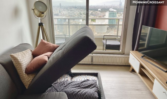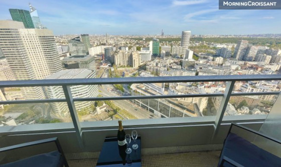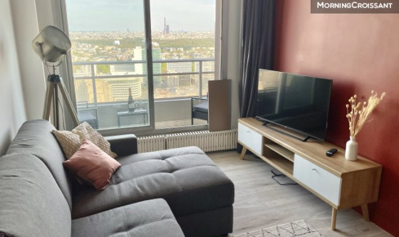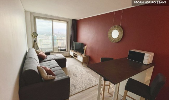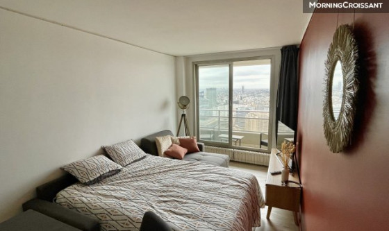 Studio d'exception très lumineux et confortable, entièrement meublé et équipé de 25 m², internet, refait à neuf en 2022 et idéal pour quelqu'un cherchant un pied-à-terre à Paris/La Défense pour y loger/travailler. Dans un immeuble de standing récent et sécurisé avec gardien 24/24 et vidéo surveillance, au 35ème étage (ascenseurs), très lumineux et calme, avec une vue panoramique exceptionnelle sur tout Paris sans vis-à-vis et complété par un balcon de 3 m² exposé Sud-Ouest. A 7 min à pied du centre commercial Les 4 Temps et de ses transports (RER A, Metro 1, Transilien L et U, Tramway, Bus, etc.). L'entrée dessert : - Une salle de bains avec baignoire, WC, vasque et lave-linge séchant ; - Un grand séjour baigné de lumière avec cuisine américaine entièrement équipée (plaques induction, four, micro-onde, hotte, réfrigérateur avec espace de congélation, machine à café, bouilloire, etc.), une grande baie vitrée sur balcon, un canapé d'angle convertible (RAPIDO) pour couchage quotidien (140x190), TV 4K, etc. ; - Un dressing dédié dans une pièce à part. Entièrement meublé et équipé, vous n'aurez qu'à déposer vos valises et profiter de la vue.