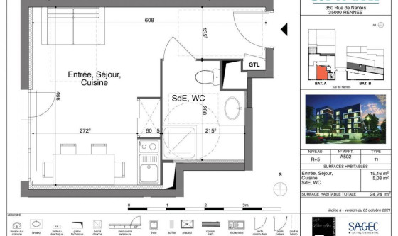 RENNES, dans une résidence étudiante de 2024, un studio de 24.24m² situé au 5ème étage avec ascenseur. Il comprend une entrée, une pièce de vie, un coin cuisine aménagé et équipé (plaques, hotte, frigo), une salle d'eau avec wc. Une laverie commune ainsi qu'une salle commune sont à dispositions des résidents. La ligne de bus C5 rejoignant le centre ville est à 3 min à pied Conditions de ressources Loi Pinel et GLI. Disponible le 8 décembre. « Les informations sur les risques auxquels ce bien est exposé sont disponibles sur le site Géorisques : www.georisques.gouv.fr »