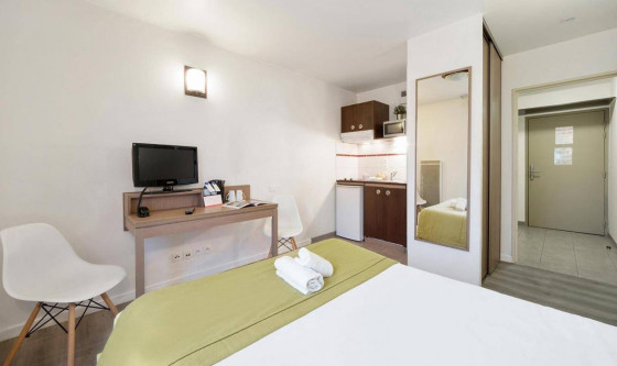 Situee dans un quartier proche de Paris, sejourner dans la residence Zenitude Saint Cyr l'Ecole, vous permettra d'etre a proximite de toutes les commodités. Dote d'un parking privé, d'une réception disponible 24/24h, vous pourrez y sejourner en toute tranquillite. Les appartements sont tous dotés d'un espace bureau, d'un coin salon avec une télévision à écran LCD et d'une cuisine équipée de plaques de cuisson, réfrigérateur, micro-ondes, lave-vaisselle, bouilloire et kit vaisselle. Mise à jour le 06/10/2025 Ref : 2715