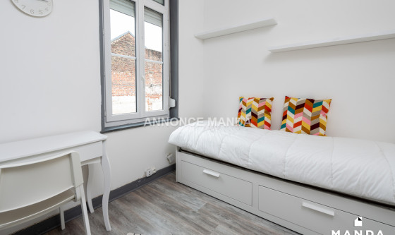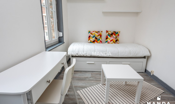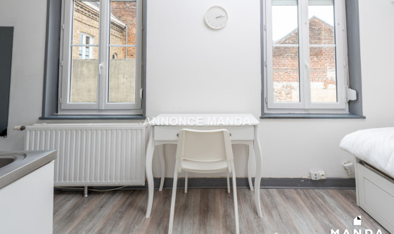 Logement Manda ! A 5 minutes de la gare d'Amiens, Manda propose un T1 en location rue Vatable. Situé au 1er étage sans ascenseur, ce studio refait à neuf est loué meublé. L'entrée dispose de l'interphone et mène à la pièce de vie. La pièce principale se compose du coin nuit avec lit gigogne et d'un espace bureau. Les deux fenêtres donnent sur la cour intérieure, très au calme. La cuisine est ouverte et équipée. La salle de bain se compose d'une cabine de douche, d'un meuble sous vasque et d'un miroir. Les WC sont dans la salle de bain. Très belles prestations pour ce T1 en location : refait à neuf récemment, très lumineux, calme, situé dans un petit immeuble de charme de 5 logements, bien agencé, meublé et équipé, ouvertures sur cour, entrée par la cour sécurisée... Idéalement situé à 700m de la gare d'Amiens sans le quartier Saint-Anne, proche de toutes les commodités. Vous aurez un accès en transport en communs aux facultés tout en bénéficiant d'un environnement calme. Idéal pour étudiant(e) ou jeune actif(ve), n'attendez plus pour déposer votre candidature ! Référence du bien : MANDA-13496