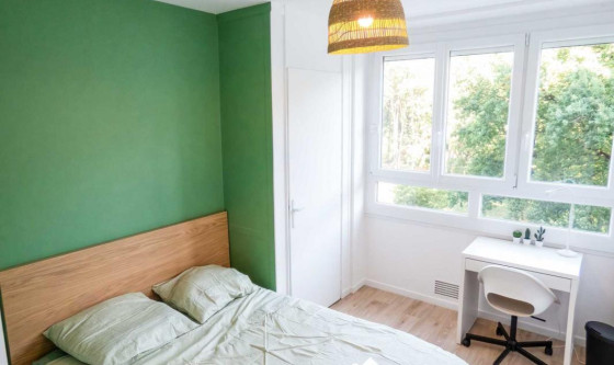 ## Space Découvrez une chambre privative confortable et meublée au sein d'un appartement lumineux de 78 m² en colocation, situé au 35 rue du Parc à Bron, au 4ᵉ étage avec ascenseur. L'appartement compte 4 chambres au total, partagées entre colocataires. Idéale pour une personne, cette chambre vous offre un espace paisible tout en profitant des pièces communes conviviales. Votre chambre privative comprend : Lit double confortable Un espace de travail avec un bureau Rangements Espaces communs Un salon avec canapé, coin repas, TV et balcon communiquant avec deux chambres Une cuisine ouverte équipée avec bar et chaises longues : plaques de cuisson, four, micro-ondes, réfrigérateur, lave-vaisselle, cafetière, grille-pain, bouilloire, ustensiles Une salle d'eau avec douche, lavabo et lave-linge Un WC indépendant Les points forts de cet appartement : Connexion Internet haut débit incluse Espaces communs confortables et bien aménagés Immeuble avec ascenseur Commerces et restaurants à proximité immédiate Accès rapide aux transports en commun Quartier calme, proche du parc de Parilly Éligible au Bail Mobilité ## Access Vous aurez accès à l'ensemble de l'appartement. ## Interaction Notre équipe reste disponible par téléphone ou SMS de 9h à 23h pour toute question. Nous faisons de votre confort une priorité et nous sommes là pour garantir une expérience fluide et agréable. ## Neighborhood Situé dans un quartier résidentiel agréable de Bron, cet appartement offre un cadre calme et pratique, avec commerces et transports à proximité. Vous serez proche du Parc de Parilly, parfait pour des balades ou des activités en plein air. Le quartier combine tranquillité, commodité et richesse culinaire. Voici quelques suggestions de restaurants à proximité : Soleil d'Argentine Pizza – cuisine latino-argentine Tranche : €€ Bronx Food – ambiance street food Tranche : € Le Bistrot de la Cave – bistrot français convivial Tranche : €€ ## Transit L'appartement bénéficie d'un accès pratique aux transports en commun : Bus : lignes 24, 26, 34, C15, 79 (à 1-2 min à pied) Métro : ligne D à environ 5-6 min à pied Train : ligne C26 En voiture : accès facile aux grands axes et périphérique lyonnais Accès aéroport Lyon-Saint Exupéry : environ 25 à 30 min en voiture ## Notes Cette réservation implique le versement d'une caution ainsi que la signature d'un contrat. Ces dispositions garantissent la sécurité et la transparence de votre séjour (tous les détails seront précisés lors de la réservation). Updated on 18/11/2025 Mise à jour le 18/11/2025