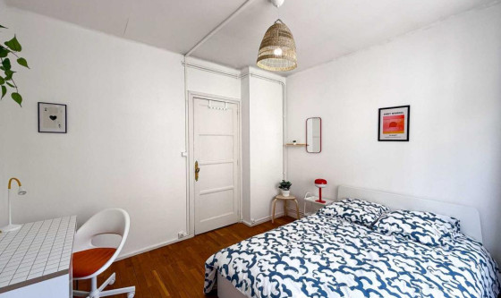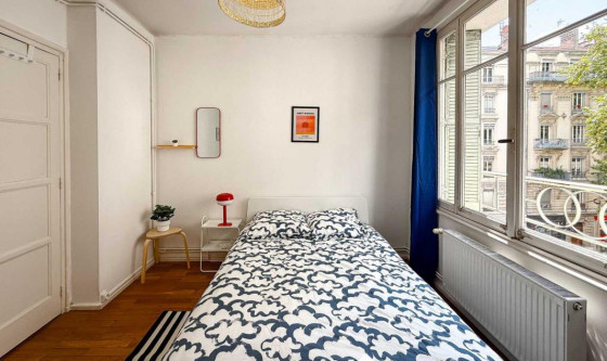 ## Space Nichée au 3ᵉ étage d'un grand appartement moderne de 85 m² avec ascenseur, cette chambre privée d'environ 10 m² offre un cadre de vie paisible et chaleureux, idéal pour les étudiants, jeunes actifs ou voyageurs souhaitant séjourner à proximité du centre de Lyon. L'appartement allie confort, espace et modernité, au cœur d'un quartier agréable et parfaitement desservi. Situé dans le 3ᵉ arrondissement de Lyon, vous profiterez d'un environnement calme et pratique, avec de nombreux commerces, restaurants et transports à quelques pas seulement. Votre chambre privative comprend : Un lit double confortable Un bureau avec espace de travail Des rangements pratiques Les pièces communes à partager : Un séjour convivial avec canapé, table à manger pour 4 personnes, table d'appoint et espace détente. Une cuisine ouverte entièrement équipée : réfrigérateur, lave-vaisselle, micro-ondes, machine à café, bouilloire, grille-pain, plaque de cuisson, hotte et petite table bar. Une salle de bain avec baignoire, lavabo et lave-linge, ainsi qu'un WC séparé pour plus de confort. Les atouts de cet appartement : Connexion Internet haut débit incluse. Draps et serviettes de qualité fournis. Appartement lumineux et calme. Accès rapide au centre de Lyon grâce aux transports en commun à proximité directe. Quartier vivant, agréable et bien desservi. ## Access Vous aurez accès à votre chambre privée ainsi qu'à tous les espaces communs de l'appartement (salon, cuisine, salle de bain). ## Interaction L'équipe Checkmyguest reste disponible par téléphone ou message de 9h à 23h pour toute question. Nous mettons tout en œuvre pour rendre votre séjour agréable, fluide et confortable. ## Neighborhood L'appartement est idéalement situé dans le 3ᵉ arrondissement de Lyon, un quartier dynamique, résidentiel et central, parfait pour profiter pleinement de la ville. À quelques minutes à pied, vous trouverez : Boulangeries, supermarchés et commerces de proximité Restaurants et cafés pour tous les goûts Parcs et espaces verts pour se détendre après une journée bien remplie Quelques adresses à découvrir : Brasserie Georges – institution lyonnaise, cuisine traditionnelle et ambiance conviviale Tranche : €€ Le Temps d'un Café – restaurant chaleureux avec terrasse, idéal pour bruncher ou déjeuner entre amis Tranche : € Matsuri Lyon Félix Faure – restaurant japonais avec sushi-bar, à quelques pas de l'appartement Tranche : €€ ## Transit L'appartement bénéficie d'un emplacement privilégié pour vos déplacements dans Lyon et ses environs : Métro ligne D – Garibaldi à quelques minutes à pied (accès direct au centre-ville et à la gare Part-Dieu) Tramway T3 et T4 à proximité Plusieurs lignes de bus desservent le quartier Accès facile au périphérique pour rejoindre rapidement les différents quartiers de la ville Aéroport Lyon-Saint-Exupéry accessible en transport ou via la navette Rhônexpress depuis Part-Dieu ## Notes Cette réservation implique le versement d'une caution ainsi que la signature d'un contrat. Ces dispositions garantissent la sécurité et la transparence de votre séjour (tous les détails seront précisés lors de la réservation). Updated on 22/11/2025 Mise à jour le 22/11/2025