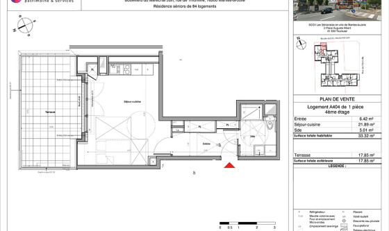 A louer T1 de 33 m² donnant sur une belle terrasse de 18 m² au 4e et dernier étage. L'appartement dispose d'un séjour/cuisine équipée de 21.8 m2 et d'une salle d'eau. La résidence Les Senioriales® de MANTES-GASSICOURT : Située dans le quartier résidentiel et recherché de Gassicourt, à quelques minutes du centre-ville de Mantes-la-Jolie, la résidence allie emplacement privilégié et qualité de vie (parc boisé et classé au sein de la résidence). Un cadre de vie pensé pour les seniors : - Présence d'un directeur de site et d'une animatrice dédiée, assurant la gestion des services à la carte, l'animation et l'entretien des espaces communs. - Appartements fonctionnels et entièrement équipés : volets roulants électriques, salle d'eau ergonomique, cuisine aménagée. - Espaces communs conviviaux : animations régulières au Salon-Club, favorisant le lien social entre résidents.