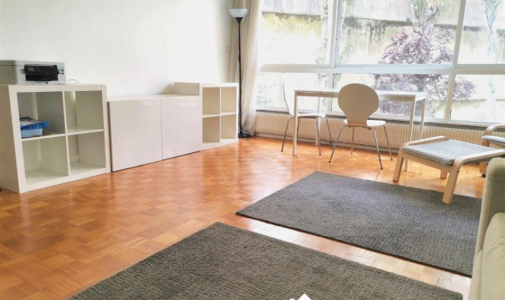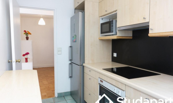 Nice and large studio located at 104 Bd Arago, Paris 14e – on the 2nd floor with elevator (3min by foot from metro/RER Denfert-Rochereau, Saint Jacques, and many bus lines). + Quiet neighborhood, nearby commercial areas (rue Daguerre, Av General Leclerc): many supermarkets (Monoprix, Franprix), take-outs, bakeries (Moisan, Paul), cafes, restaurants, bars, banks, stores, gyms, pharmacies, florists, etc., and hospitals (Sainte-Anne, Cochin), etc. + The studio has been completely renovated, very bright, with very large windows with wide garden view. The layout of the studio is well distributed, with a large kitchen and large bathroom. + Large fully furnished living area: sofa bed with comfortable mattress (for 2 persons), table, chairs, book shelves, cupboards, all household linens, cooking utensils, dining wares, etc. + Well equipped and independent kitchen: large 2-doors refrigerator, washing/drying machine, induction hotplates, large oven, micro-waves oven. + Several large built-in cupboards for storage + Very secure residence, with caretaker, digicode and intercom. + Very easy parking on the streets. + Monthly rent includes (management fees, including collective heating, hot water). Updated on 19/11/2025 Mise à jour le 19/11/2025
