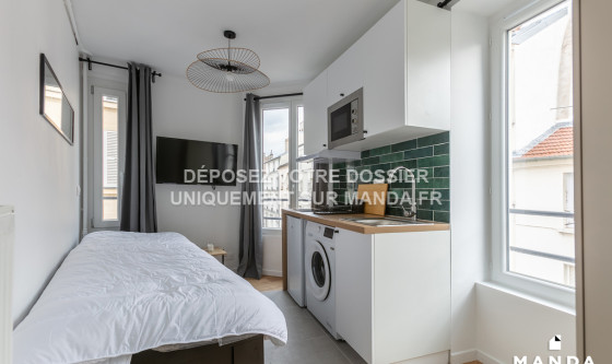 Logement Manda ! Visitez et déposez votre dossier uniquement sur notre plateforme ! Nous ne vous enverrons jamais le bail ou le RIB par mail - tout est sécurisé sur notre plateforme. L'agence Manda vous propose ce joli studio meublé, situé à Paris dans le 17ème. Cet appartement est composé du séjour avec lit, de la cuisine ouverte équipée avec machine à laver et de la salle d'eau avec douche. Idéalement situé dans un quartier résidentiel paisible et bien desservi, le logement est à proximité des commerces, des écoles et des transports en commun. Disponible immédiatement, ce joli studio en location n'attend que vous ! Pour rappel, cet appartement est situé dans une zone soumise à encadrement des loyers. Loyer de base : 412,8€ Loyer de référence majoré (Loyer de base à ne pas dépasser) : 495,6€ Complément de loyer : 254,4€ VOUS POUVEZ VISITER PLUS DE 3 000 LOGEMENTS (visite virtuelle + vidéos) ET DÉPOSER VOTRE CANDIDATURE SUR LE SITE WEB MANDA (REF : MANDA-63597) Référence du bien : MANDA-63597