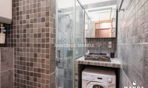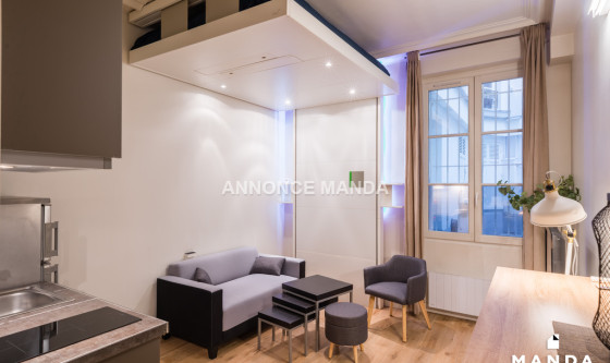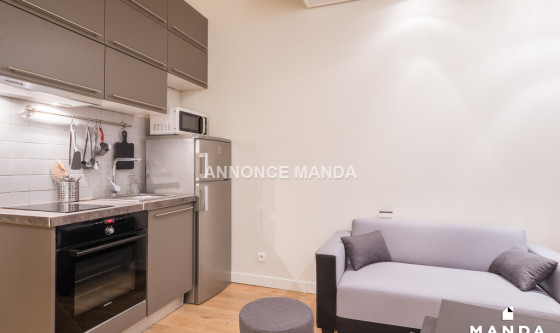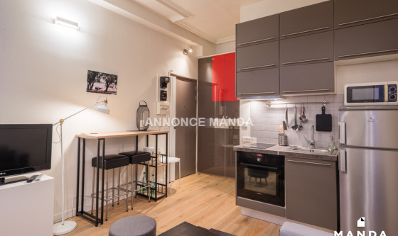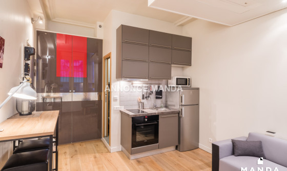 Logement Manda ! A 2 minutes du métro Château Rouge et à côté du quartier Village Ramey, Manda propose un T1 en location rue Custine. Situé au rez-de-chaussée, ce studio parfaitement optimisé est loué meublé. L'entrée dispose d'un large placard avec penderie et étagères. La pièce principale propose un coin salon, composé d'un canapé deux places, de trois tables basses, d'un fauteuil, d'un pouf, d'un meuble TV surmonté de son écran plat et d'une fenêtre donnant sur la cour intérieure de l'immeuble. Le coin déjeuner (ou bureau) propose une table et deux chaises hautes. La cuisine, ouverte sur le séjour, est équipée de plaques de cuisson, d'une hotte, d'un four, d'un réfrigérateur avec congélateur, d'un micro-ondes, d'un évier simple bac et de nombreux placards de rangement avec de la vaisselle. Le coin nuit se trouve dans la pièce principale : le lit deux places est sur rails et descend du plafond afin de transformer le coin salon en chambre à coucher. La salle de bain dispose d'une belle vasque carrée, d'un miroir, d'une cabine de douche carrelée et du lave-linge. Les WC sont dans la salle de bain. Prestations de grande qualité pour ce T1 en location : très bien agencé, tranquillité grâce à l'exposition sur cour, optimisation maximale de l'espace, belle hauteur sous plafond... Le métro Château Roule ligne 4 est à 2 minutes à pied, le quartier de la Goutte d'Or est à moins de 500m et tous les commerces et restaurants sont à proximité immédiate. Idéal pour une personne seule ou un jeune couple, n'attendez plus et déposez votre candidature ! Pour rappel, cet appartement est situé dans une zone soumise à encadrement des loyers. Loyer de base : 528,7€ Loyer de référence majoré (Loyer de base à ne pas dépasser) : 634,1€ Complément de loyer : 263,17€ Référence du bien : MANDA-08368