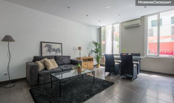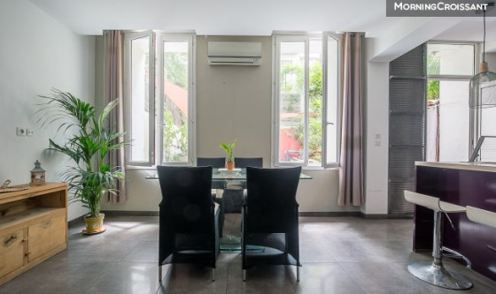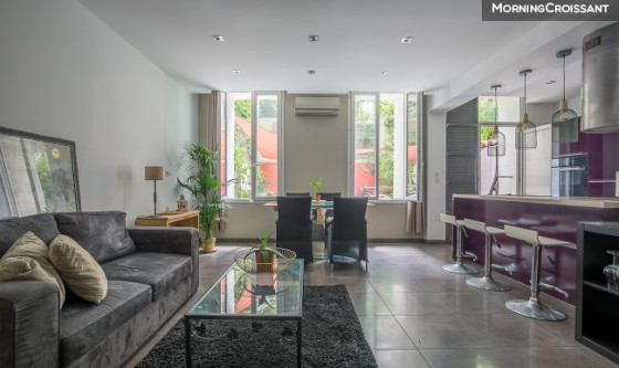 Charmant appartement T2 de 47 m² (Loi Carrez), en rez-de-jardin d'un immeuble typiquement marseillais, idéalement situé au 7 rue César Aleman (13007), à deux pas de la plage des Catalans. Ce lieu au style loft se compose d'un séjour lumineux et climatisé avec cuisine américaine équipée, donnant sur un jardin de 54 m² exposé plein Sud, au calme absolu. Aménagé pour profiter pleinement des beaux jours, cet extérieur offre un véritable espace de détente, protégé de l'agitation urbaine, où le chant des oiseaux vient parfaire l'ambiance paisible. La chambre cosy est accessible par des portes à galandage, tout comme la salle d'eau moderne avec douche à l'italienne et WC. Un lieu de vie rare, dans un quartier central proche de toutes les commodités, du parc du Pharo, de la Corniche et de la plage!