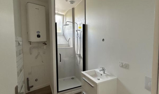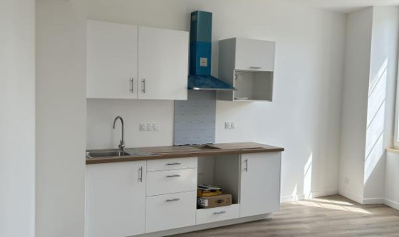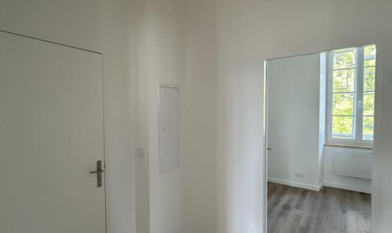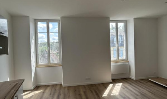 COEUR du village de SALIES DE BEARN, dans secteur privilégié au calme Dans bâtiment ancien entièrement rénové au 1er étage, A LOUER T2 d'une superficie de 45.55 m² neuf 1ère location, l'appartement comprend une entrée, un séjour avec cuisine ouverte aménagée meubles hauts et bas, plaques 2 feux et hotte aspirante, 1 chambre avec placard, salle d'eau avec meuble vasque, sèche serviette, wc suspendu, cellier. chauffage ind électrique, eau chaude par cumulus, eau froide individuelle logement disponible de suite n'hésitez pas à nous contacter