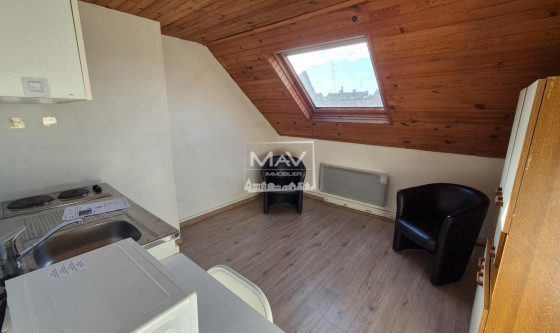 A LOUER - TOURCOING - T2 MEUBLÉ de 19,23m² situé au 2ème et dernier étage d'un petit immeuble calme, composé d'un séjour, un coin cuisine équipée meublée (plaques électriques, réfrigérateur, micro-onde), une chambre, salle de bain avec douche, lavabo, wc. Idéal pour étudiant ou jeune salarié. Menuiserie en double vitrage bois et chauffage individuel électrique. Libre immédiatement. Proche du lycée/ CFA Le Corbusier, de l'école des douanes, de Tourcoing Centre, de toutes commodités (Métro, station V'Lille, Centre Commercial St Christophe). Loyer: 506€ dont Charges : 45€ (eau froide, entretiens communs) - Dépôt de garantie : 922€ - Honoraire de location : 249,99€ dont 57,69€ d'état des lieux