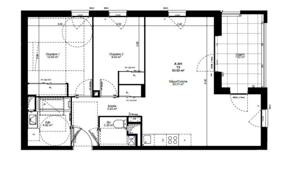 A201 OXYGENE - VENEZ PROFITER DEURUN JOLI T3 DE 63M²CALME ET CLAIR AVEC BALCON A L'INTERIEUR D'UNE RESIDENCE NEUVE BBC DE STANDING. Il est composé dEURune belle pièce de vie, placard d'entrée, d'une cuisine US (meubles haut et bas, hotte, plaque de cuisson et four) donnant sur le balcon, deux chambres en sol parquet dont une avec placard, une salle de bain aménagée avec meuble sous vasque et sèche serviette. Deux places de parking en sous-sol. Chauffage individuel gaz. Visiophone. Consommation d'énergie totale entre 510-740EUR par an (prix moyens des énergies indexés au 2021.2022.2023). Les informations sur les risques auxquels ce bien est exposé sont disponibles sur le site Géorisques : www. georisques. gouv. fr