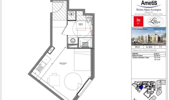 Vivez sereinement à «L'Obsidienne», votre nouvelle résidence senior à Feyzin. Située au coeur de Feyzin, cette résidence offre un cadre de vie à la fois serein et pratique, à proximité immédiate des commerces, des services de santé et des transports en commun. L'environnement calme et verdoyant, combiné à une accessibilité facilitée et à la vie de quartier conviviale, permet de conserver autonomie tout en profitant d'un quotidien confortable et rassurant. L'Obsidienne est une résidence Vill'Age spécifiquement conçue pour faciliter la vie des seniors et offrir un cadre de vie rassurant. Elle propose des prestations de qualité alliant confort, convivialité et sécurité. Le programme comprend 52 logements, du T1 au T3, et met à disposition des services collectifs (salle commune climatisée, animations, espaces verts?) tout en respectant l'indépendance de chacun. accompagnateur Vill'Age est également présent en journée pour faciliter votre quotidien et assurer le bon fonctionnement de la résidence. Lyon Métropole Habitat vous propose à la location un spacieux T1 de 27,11 m², confortable et spécialement adapté à la mobilité des seniors. Le logement dispose d'une entrée, d'une pièce de 21,53 m² avec une cuisine ouverte et d'une salle d'eau spécialement aménagée avec receveur extra-plat, barres de maintien, siège de douche et WC ergonomiques. Loyer : 325,02 euros (CC* sans chauffage et eau). Sans frais d'agence En option et en fonction des disponibilités, un garage boxé est à votre disposition en sus du loyer à 51,31 euros. Chauffage individuel au gaz. Condition éligibilité : Ce logement est soumis au plafond de ressource PLS. *Loyer mensuel charges comprises (données à titre indicatif, susceptible d'évolution, sous réserve d'éligibilité). Cette résidence est exclusivement réservée aux seniors.