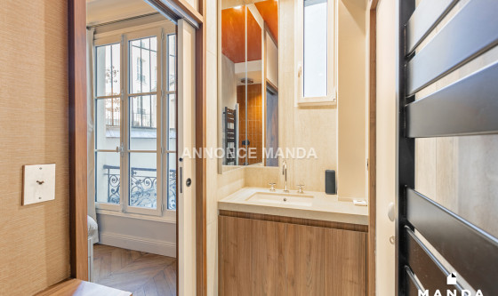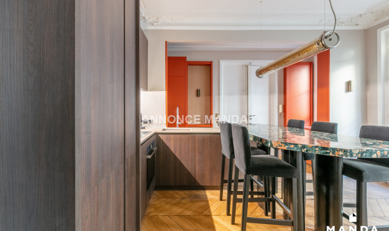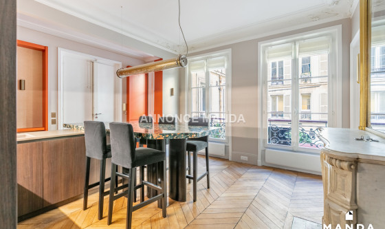 Logement Manda ! Situé à Paris, ce T3 meublé se trouve rue La Fayette. Non loin de l'arrêt de métro Gare du Nord et Poissonnière, le logement est proche de toute commodité. Magnifique appartement haussmannien de type T3/T4, ayant conservé toutes ses caractéristiques (3m de hauteur sous plafond, parquet en pointe de hongrie, moulures, cheminées), ayant bénéficié d'une rénovation haut de gamme par un architecte d'intérieur décorateur de renom. Il a été mis en valeur avec de nombreux et beaux agencements sur mesure et avec des matériaux haut de gamme (marbre style Terrazzo, fenêtres en bois à l'ancienne en double vitrage, luminaires de designers, nombreux placards sur mesure, cuisine haut de gamme intégrée, salle de bain en agencement sur mesure avec belle robinetterie, radiateurs électriques pilotables...). L'appartement possède une pièce principale de réception sous forme de salle à manger/cuisine ouverte sur l'entrée. Il y a également un salon, une master chambre, une deuxième chambre qui peut servir de bureau, une salle de bain et des toilettes séparées. L'appartement est très lumineux car il est traversant et qu'il possède de belles grandes fenêtres. Il est très calme car sur double cour, et ce sont des bureaux à l'étage du dessus et du dessous (aucun voisin le soir et le weekend) . Ce magnifique T3 en location n'attend plus que vous ! Pour rappel, cet appartement est situé dans une zone soumise à encadrement des loyers. Loyer de base : 1848,0€ Loyer de référence majoré (Loyer de base à ne pas dépasser) : 2217,6€ Complément de loyer : 368,23€ Référence du bien : MANDA-46343