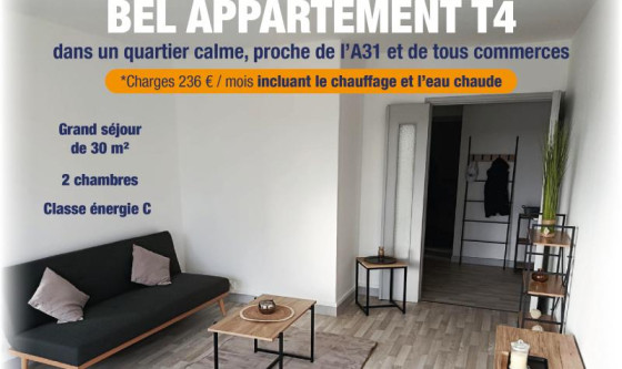 Bel appartement renové au dernier étage du bâtiment A proximité de tous les commerces, écoles, axe autoroutier A31 Ce logement de 74 m2 vous offre une vue dégagée Le loyer est de 321.82 € les charges de 236.99 € comprennent le chauffage collectif et l'eau chaude Pas de frais de dossier Service technique et de proximité Loyer payable en fin de mois Calcul de l'APL sans engagement Possibilité de réduction du préavis