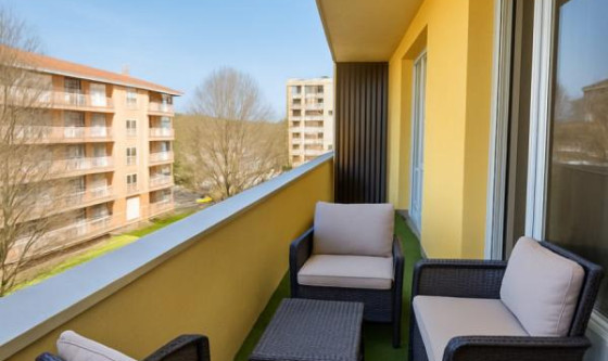L'emplacement permet de profiter des commodités à pied, avec un supermarché SPAR à 350 mètres et un accès rapide au centre-ville grâce aux lignes de bus et au Tram Divia à proximité. Il est également possible de louer un garage en supplément.